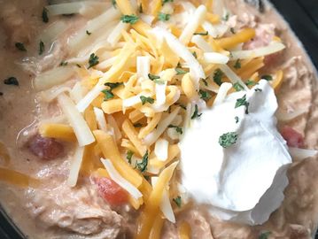 chicken, salsa, chicken broth, cream cheese, taco seasoning, olives