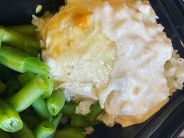 Chicken thighs, cream cheese, green chilis, cumin, garlic, Monterrey jack cheese, cauliflower rice, green beans
