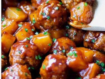 Beef Meatballs, Aminos, Rice Vinegar, Brown Sugar substitute, Sugar Free BBQ Sauce, Sesame Oil, Pineapple, Cauliflower Rice, Mixed Veggies
