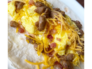 Eggs, Bacon, Sausage, Shredded Cheese, Heavy Cream Low-carb tortilla