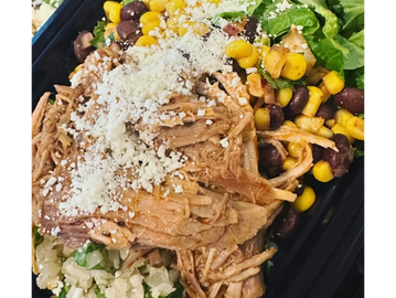 pork shoulder, Dr Pepper zero, red enchilada sauce, green chilis, brown sugar substitute, lettuce, cauliflower rice, cilantro, cojita cheese, cilantro lime dressing, black beans, corn