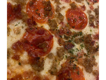 almond flour, eggs, mozzarella cheese, cream cheese, seasoning, pepperoni, sausage, pizza sauce, tomato paste, bacon