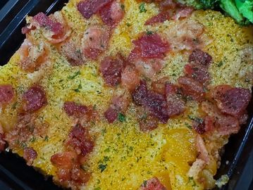 Ground Hamburger, Bacon, Eggs, Shredded Cheese, Tomato Past, Heavy Cream, Seasonings, Mixed Veggies