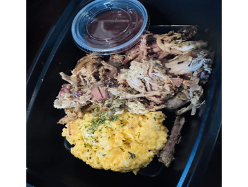 pork shoulder, seasonings, cauliflower rice, heavy cream, cream cheese, sharp cheddar, bbq sauce