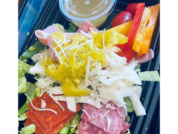 lettuce, pepperoni, ham, salami, tomatoes, bell peppers, pepperoncini peppers, Italian dressing, mozzarella cheese